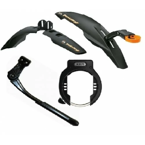 Udstyrspakke til Børne MTB indeholdende -Støtteben-Skærmesæt (for og bag)-Fastmonteret låsUdstyrspakken er et tilbud der kun kan vælges samtidigt med en Børne Mountainbike i størrelse 20″ eller 24″. Til gengæld monteres udstyrspakken på cyklen inden den afsendes fra os.Låsetypen og evt. monteringsbeslag, vælges af mekanikeren alt efter stel- og monteringstype.Låsen er en forsikringsgodkendt lås med nøgle.Der bruges udelukkende kvalitets udstyr fra kendte brands