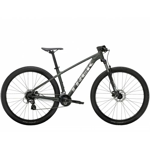Marlin 5 er både klar til sporene og den daglige transport. Den har en affjedret forgaffel, 2×8 gear og studser til bagagebærer og støttefod, der gør den ideel til begyndere i terrænet og enhver, som vil have en komfortabel og stabil pendlercykel med en rigtig mountainbikes rå styrke og look.Den er det rigtige valg for dig, hvis…Du er ny på MTB og vil have en ægte mountainbike, der også kan bruges til den daglige transport – til en rigtig god pris.TeknologienEt letvægtsstel i aluminium med indvendigt opbevaringsrum og indvendig kabelføring, som beskytter kablerne og giver et ekstra strømlinet look, 2×8 gear med et bredt gearområde, så det aldrig er for svært eller let at træde i pedalerne, stærke hydrauliske skivebremser og en affjedringsforgaffel med lockout til de værste ujævnheder.Kort sagtMarlin 5 er en fremragende cykel til alle former for eventyr. Men den er også fleksibel, og Marlin 5 er desuden populær til almindelig transport, fordi studserne til bagagebærer og støttefod gør den nem at udstyre med tilbehør.Specifikationer:*specifikationer gælder alle størrelser, medmindre andet er angivetStel: Alpha Silver Aluminum, indvendig kabelføring, skivebremsemontering på kædestag, studser til bagagebærer og støttefod, 135×5 mm QR*Forgaffel Size: XXSSR Suntour XCM 30, metalfjeder, lockout, preload, 100 mm QR, 100 mm vandring, 26″ fælgeSize: XSSR Suntour XCT 30, metalfjeder, preload, hydraulisk lockout, 42 mm offset til 27,5″ fælge, 100 mm QR, 80 mm vandringSize: SSR Suntour XCT 30, metalfjeder, preload, hydraulisk lockout, 42 mm offset til 27,5″ hjul, 100 mm QR, 100 mm vandringSize: M , ML , L , XL , XXLSR Suntour XCT 30, metalfjeder, preload, hydraulisk lockout, 46 mm offset til 29″ fælge, 100 mm QR, 100 mm vandringMaks. kompatibel forgaffelvandring: 100mm (XS & S: 490mm axle-to-crown, M & up: 509mm axle-to-crown)Fornav: Formula DC-20, alu, 6-bolts, 5×100 mm QRBagnav: Formula DC-22, alu, 6-bolt, Shimano 8/9/10 frinav, 135×5 mm QR*Fælg Size: XXSBontrager Connection, alu, dobbeltvægget, 32 huller, 20 mm bredde, autoventilSize: XS , S , M , ML , L , XL , XXLBontrager Connection, dobbeltbund, 32-huller, 20 mm bredde, autoventilEger: 14g rustfrit stål*Dæk Size: XXSBontrager XR2 Comp, stålkanttråd, 30 tpi, 26×2,20″Size: XS , SBontrager XR2 Comp, stålkanttråd, 30 tpi, 27,5×2,20″Size: M , ML , L , XL , XXLBontrager XR2 Comp, stålkanttråd, 30 tpi, 29×2,20″Maks. dækstørrelse Ramme: 29×2.20″ (XS & S: 27.5×2.4″) Forgaffel: Se producentGearskifter: Shimano Altus M315, 8-gearForskifter: Shimano Altus M315, 34,9 mm klampe, topsving, dual pullBagskifter: Shimano Altus M310*Kranksæt:Size: XXSProwheel TM-CY10, 36/22, 160 mm længdeSize: XS , S , MShimano M315, 36/22, 170 mm længdeSize: ML , L , XL , XXLShimano M315, 36/22, 175 mm længdeKrankboks: Sealed cartridge, 73mmKassette: Shimano 8-gear, 12-32TKæde: KMC Z8.3, 8 speedPedal: VP-536 nylonplatformMaks. klingestørrelse: 1x/2x: 34T, 3x: 42TSadel: Bontrager Arvada, stålskinner, 138 mm bredde*Sadelpind:Size: XXSBontrager alu, 31,6 mm, 12 mm offset, 300 mm længdeSize: XS , S , MBontrager alu, 31,6 mm, 12 mm offset, 330 mm længdeSize: ML , L , XL , XXLBontrager alu, 31,6 mm, 12 mm offset, 400 mm længde*Styr Size: XXS , XSBontrager alu, 31,8 mm, 5 mm højde, 690 mm breddeSize: S , M , ML , L , XL , XXLBontrager alu, 31,8 mm, 5 mm højde, 720 mm breddeHåndtag: Bontrager XR Endurance Comp*Frempind :Size: XXSBontrager alu, 31,8 mm, Blendr-kompatibel, 7 grader, 35 mm længdeSize: XSBontrager alu, 31,8 mm, Blendr-kompatibel, 7 grader, 50 mm længdeSize: SBontrager alu, 31,8 mm, Blendr-kompatibel, 7 grader, 60 mm længdeSize: MBontrager alu, 31,8 mm, Blendr-kompatibel, 7 grader, 70 mm længdeSize: ML , LBontrager alu, 31,8 mm, Blendr-kompatibel, 7 grader, 80 mm længdeSize: XL , XXLBontrager alu, 31,8 mm klampe, Blendr-kompatibel, 7 grader, 90 mm længdeHeadset: Semi-integreret, 1-1/8″Bremse: Tektro HD-M275 hydraulisk skivebremse, 180 mm rotorVægt: M – 13.97 kg / 30.81 lbsVægtgrænse: Den maksimalt tilladte vægtbelastning for denne cykel (totalvægt for cykel, rytter og bagage) er 136 kg. Model Varemærke Trek Design Farve Grå Størrelse 26″